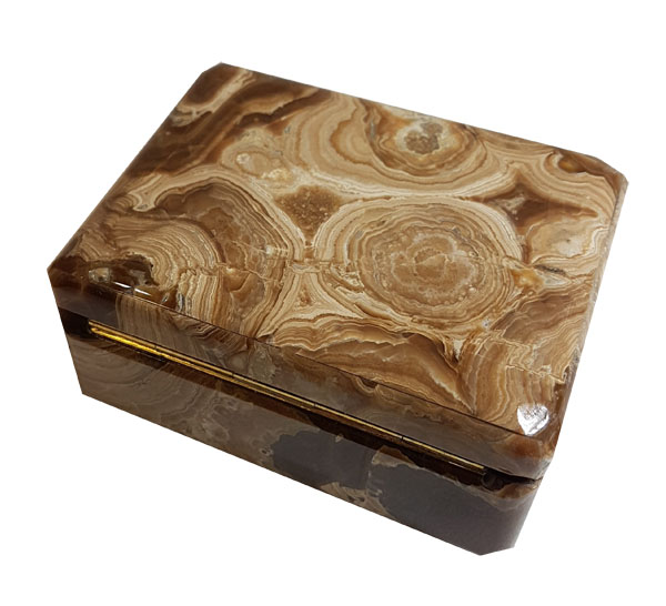- Materials: Onyx, black marble (interior), brass hinges